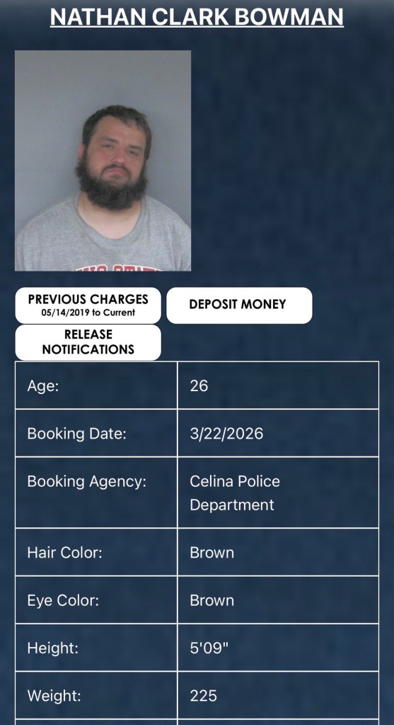 Nathan Bowman (26) of Celina was booked on a 4th degree misdemeanor of disorderly conduct and is being held on $2,500 bond.