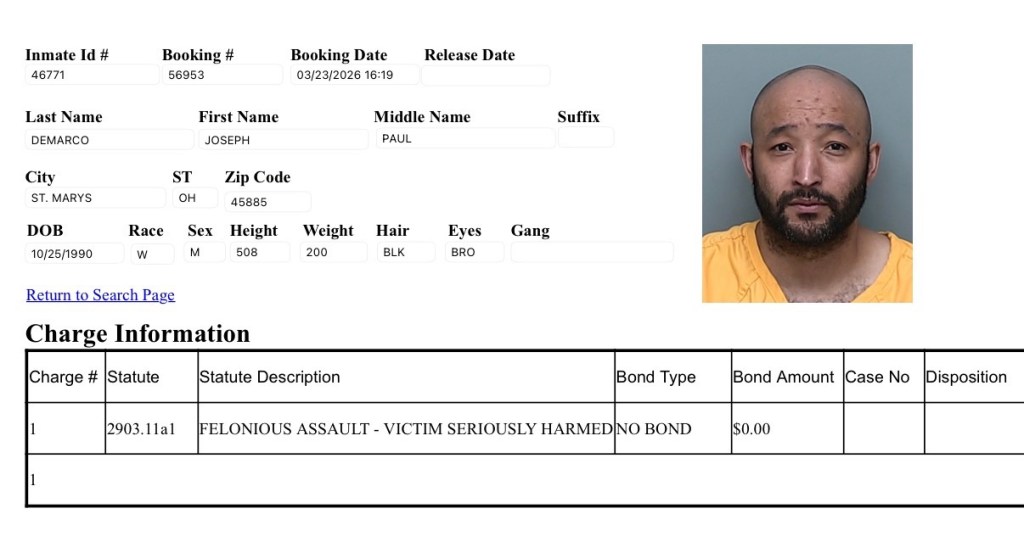 Joseph Demarco (35) of St. Marys was booked on a felonious assault charge, victim seriously harmed and is being held with no bond.