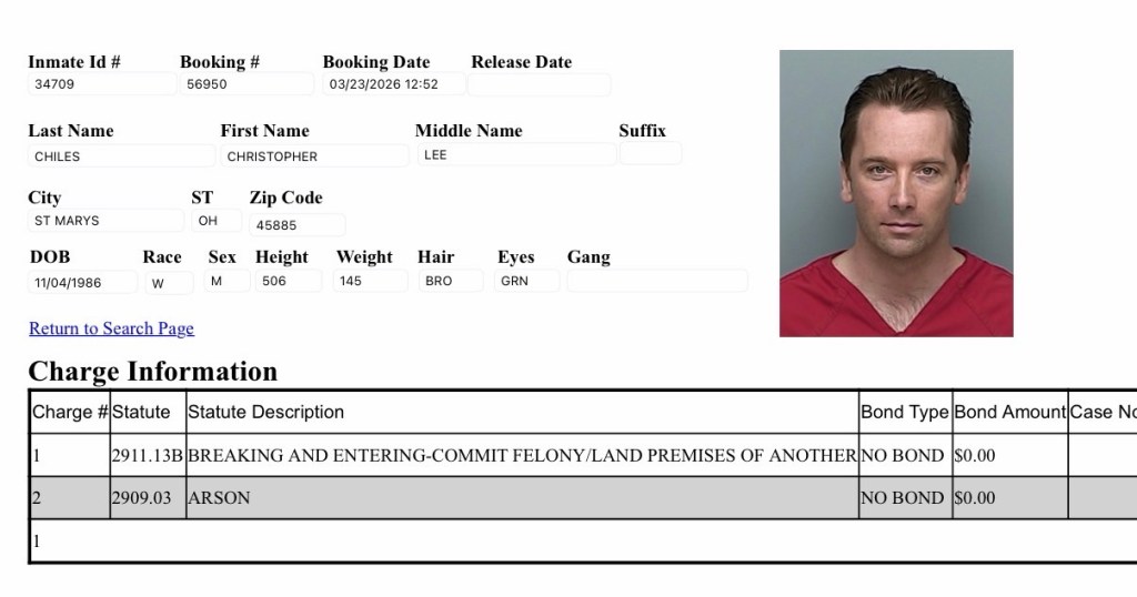 Christopher Chiles (39) of St. Marys was booked on a breaking and entering, commit felony, land premises of another and a count of arson. He is being held with no bond.
