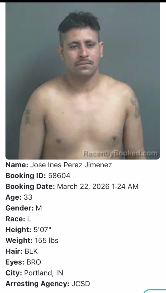 Jose Ines Perez Jimenez (33) of Portland was charged on Monday, March 23, in Jay Circuit Court, with battery with a deadly weapon, a Level 5 felony carrying up to six years in prison.