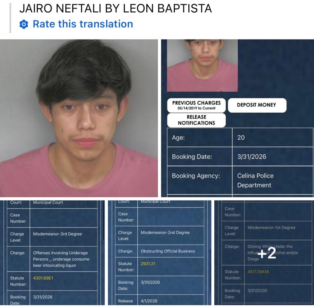 Jairo Baptista (20) was booked on several charges…3rd degree misdemeanor of offenses involving underage persons, beer, liquor, 2nd degree misdemeanor of obstruction of official business, 1st degree misdemeanor of DUI and 1st degree misdemeanor of hit/skip crash public roadway. He was released on bail today.
