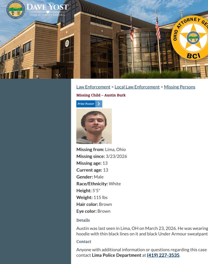 (4-2-26) Austin Burk (13) has been reported missing from Lima, Ohio, since March 23, 2026. Law enforcement and his loved ones are asking for the public’s help in locating him and bringing him home safely.