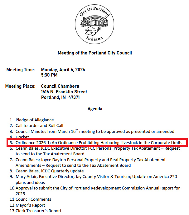 (4-7-26) Portland (Indiana) City Council last night approved an ordinance that bans roosters and sets a number limit of five on chicken hens in a 4-3 vote on the first reading.