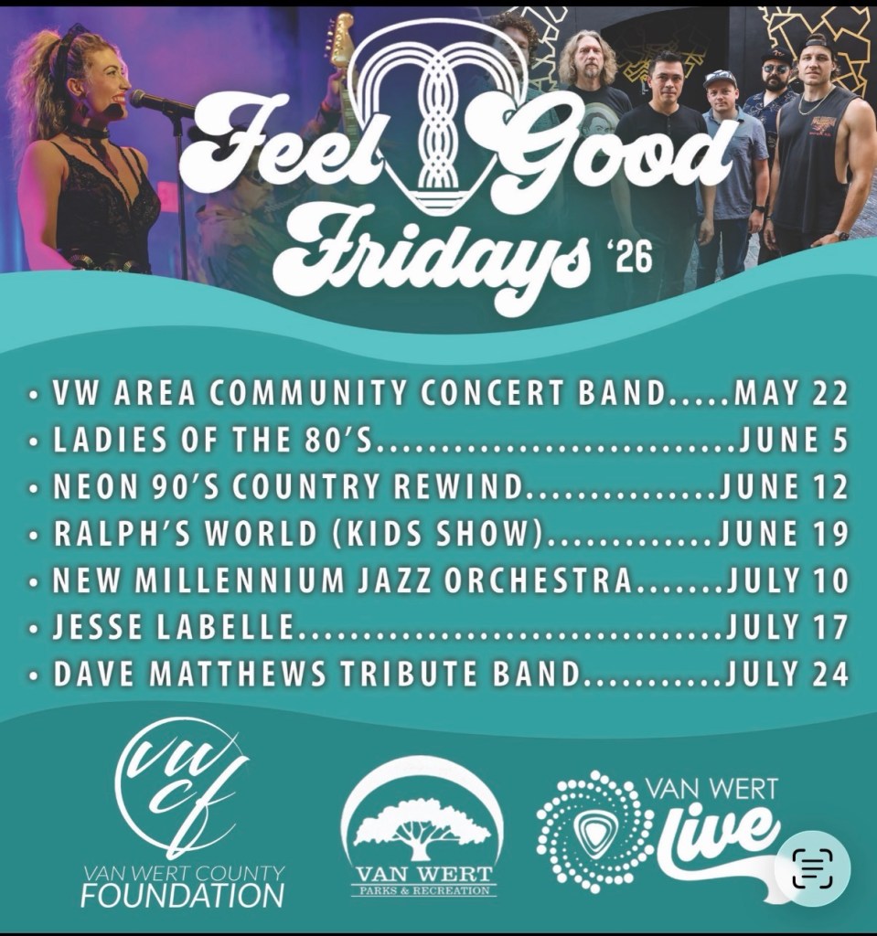 Van Wert, OH [April 8, 2026] – Van Wert LIVE is thrilled to announce the eagerly awaited “Feel Good Friday” Summer Concert Series. Thanks to the generosity of the Van Wert County Foundation, music enthusiasts can indulge in free concerts set to captivate audiences throughout the summer.
