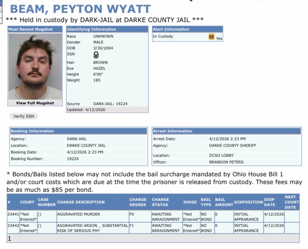 A multidisciplinary team of investigators have been working this case over the last three days. On the afternoon of April 12, 2026 Darke County Detectives arrested Peyton W. Beam (22) of rural Ansonia, OH in connection with this homicide and fire. He is being held in the Darke County Jail pending formal charges for Aggravated Murder and Aggravated Arson.
