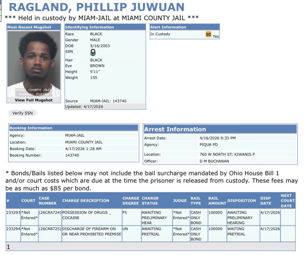 Phillip Ragland, 22, of Piqua, was arrested and charged with fourth-degree misdemeanor discharge of a firearm on or near a prohibited premises and fifth-degree felony possession of cocaine and is being held at Miami County Jail. The investigation is ongoing, and additional charges may be filed.