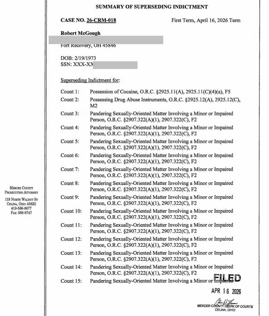 (4-24-26) Robert McGough (53) was indicted by a Mercer County grand jury on April 16th on 46 counts of pandering sexually oriented matter involving a minor and three counts of illegal use of a minor in nudity-oriented material.