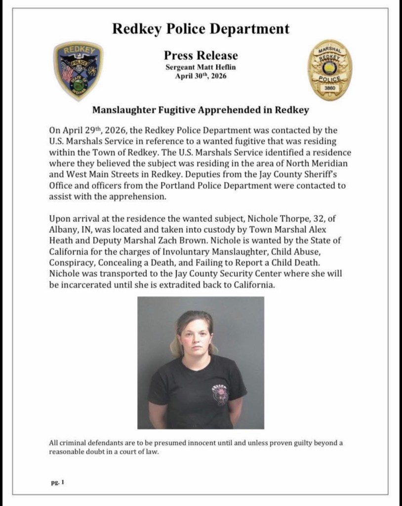 (4-30-26) Nicole Thorpe (32) of Albany, Indiana was taken into custody in Redkey.